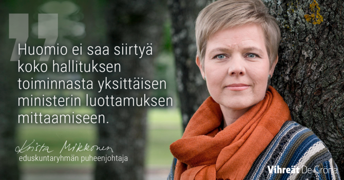 Meillä ei ole luottamusta ministerin toimintaan. Huomio ei kuitenkaan saa siirtyä koko hallituksen toiminnasta vain yksittäisen ministerin luottamuksen mittaamiseen, mikä on hyvin poikkeuksellinen toimintatapa. Tällä vuosikymmenellä niitä on ollut kaksi.